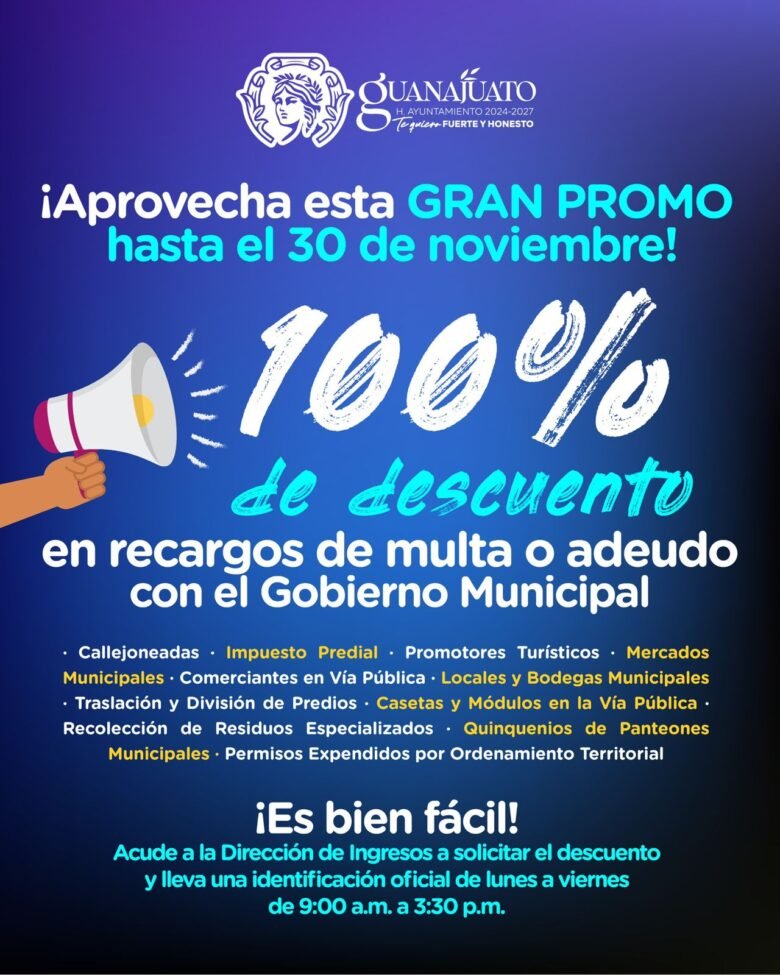 Durante todo noviembre, el gobierno municipal de Guanajuato aplicará descuentos en recargos y contribuciones municipales para apoyar la economía de las familias. Los ciudadanos podrán ponerse al corriente en pagos de Predial, permisos comerciales y otros servicios acudiendo directamente a la caja de la Dirección de Ingresos en la presidencia municipal. Para acceder al beneficio, deberán presentar su identificación oficial, ya que los pagos con descuento no se realizan en línea.