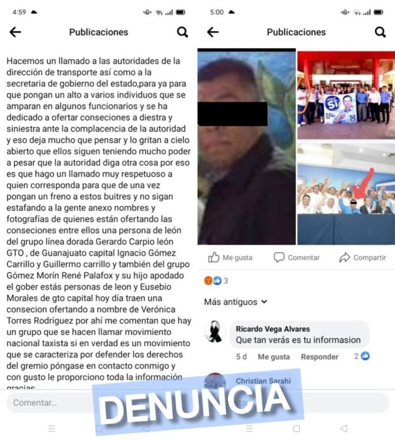 En el reporte se mencionan, de manera directa, a personas identificadas en redes sociales como Gerardo N., de Línea Dorada en León; Ignacio N. y Guillermo N., de Guanajuato capital; así como René N. y su hijo, apodado “El Gober”, vinculados al grupo Gómez Morín, además de Eusebio N., también de Guanajuato capital. Según la denuncia, estas personas no contarían con representación legal ni actas constitutivas que los acrediten como dirigentes de alguna organización formal de taxistas.