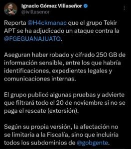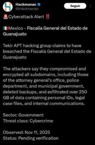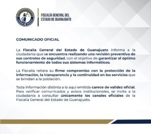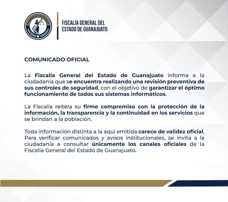 Hasta ahora, la FGEG no ha confirmado ni desmentido la autoría del ataque ni la sustracción de datos. En su comunicado, únicamente señaló que realiza una “revisión preventiva” para garantizar el funcionamiento de sus sistemas y reiteró su “compromiso con la protección de la información y la transparencia”.