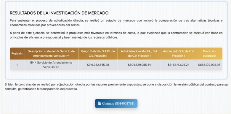 La Secretaría informó que la elección de la modalidad de adjudicación directa respondió a consideraciones de seguridad y a la naturaleza estratégica del servicio requerido, el cual no se limita a la disponibilidad de vehículos, sino que exige unidades equipadas, calibradas y listas para operación inmediata en labores de seguridad pública. Las especificaciones técnicas del equipamiento especializado reducen de manera natural el número de proveedores con capacidad real para cumplir con los requisitos establecidos.