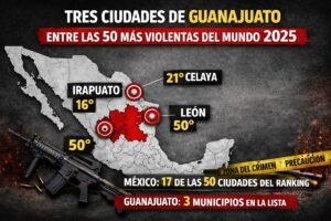 Guanajuato volvió a colocarse en el mapa internacional de la violencia urbana al registrar tres municipios dentro del Ranking 2025 de las 50 Ciudades más Violentas del Mundo, elaborado por el Consejo Ciudadano para la Seguridad Pública y la Justicia Penal, y presentado en rueda de prensa por la Comisión Mexicana de Derechos Humanos, A.C..