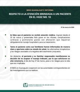 Por su parte, la delegación del IMSS en Guanajuato emitió un comunicado oficial en el que califica como falso que no se haya brindado atención médica al derechohabiente. La institución detalló que el paciente presentaba un cuadro de salud crítico, con falla renal grave y complicaciones cardiacas y pulmonares.