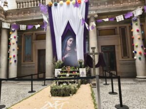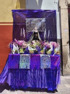 Los altares, decorados con flores, papel picado, velas y agua de betabel, tiñeron de morado y vida las calles del centro histórico, barrios tradicionales y hogares de toda la ciudad. El color morado, protagonista de esta tradición, representa el luto y la pena de la Virgen ante el sufrimiento de su hijo. Las flores evocan la belleza y la vida; las velas, la luz espiritual; y el agua, las lágrimas derramadas por María.